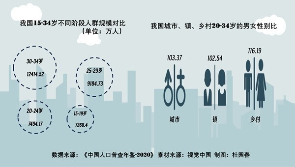 不可忽视的另一个影响指标,是男女比例。依据《中国人口普查年鉴2020》,查看各个年龄段的男女性别比,超过110的均集中在了0-29岁。进一步计算城市、镇、乡村中处于20-34岁的男女性别比,分别为103.37、102.54、116.19。这表明,我国乡村适婚年龄青年男女比例严重失衡。