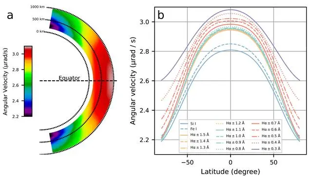 论文共同通讯作者、“羲和号”科学与应用系统总设计师李川教授告诉记者,此次凯发k8官网“羲和号”团队利用卫星采集到的多谱线、全日面、高精度的观测数据,对太阳大气层自转规律有了较为精确的认识。