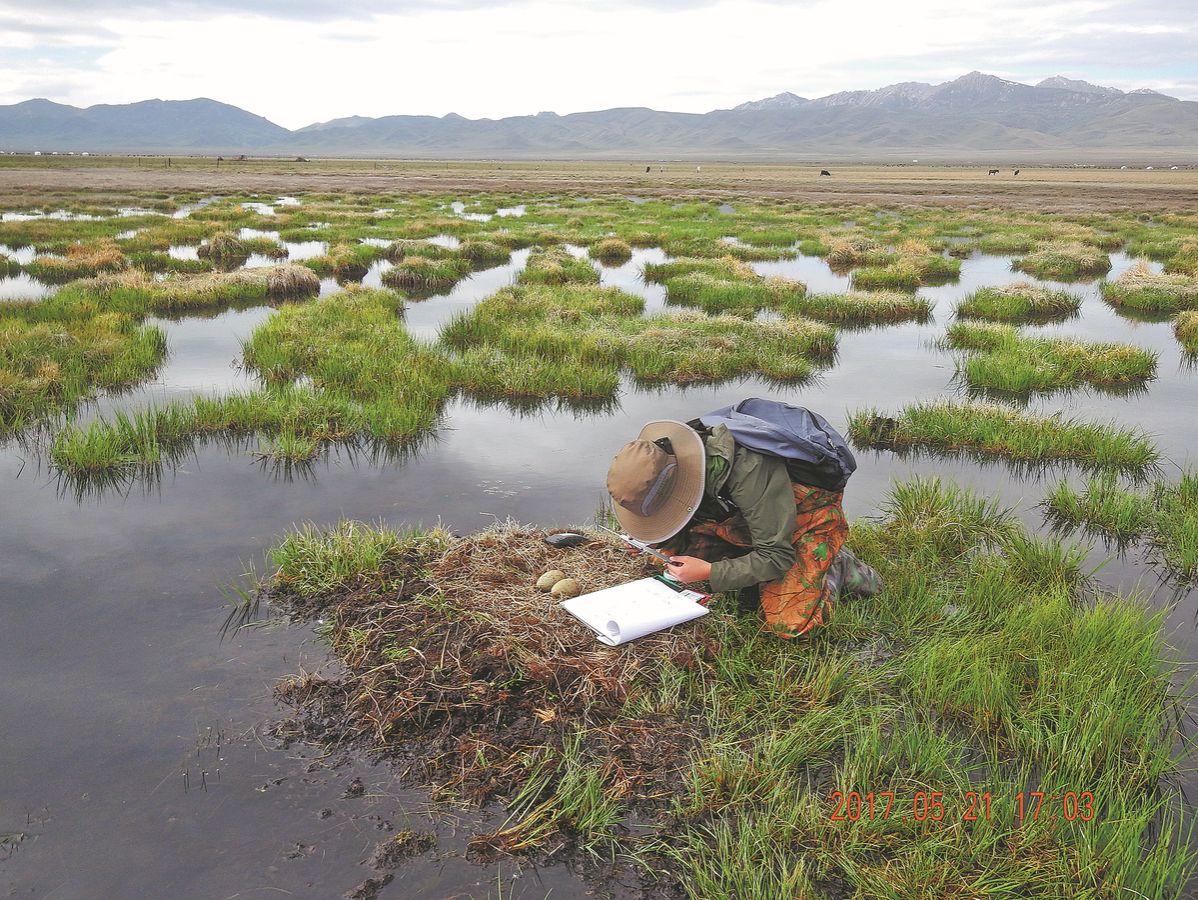 Jin Yuyi, a researcher from Sichuan University, collects data and samples from a black-necked crane nest in Zoige. CHINA DAILY