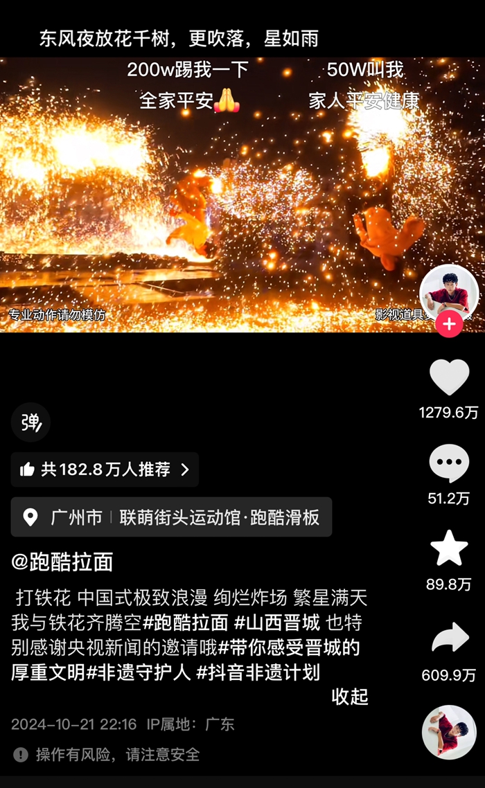 几名跑酷达人给出了答案。前段时间,达人@跑酷拉面 @跑酷阿凡 @滑脚怪等人就秀出了绝活:将1600多℃的铁水通过特殊形式放在鞋上,再接连后空翻,一时间,无数火花溅起,绽出满天繁星,让古诗中“火树银花合,星桥铁锁开”的景象活了过来,也让这段表演火了起来。