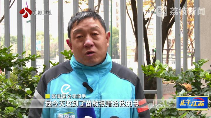 外卖骑手梁慎瑞说:“我今天收到了苗教授赠给我的书,心里很感动,真没想到,就连这个照片发到网上我也不知道。我这不是故意安排的,那天我在等单从那里经过,正好苗教授的演讲吸引了我。”