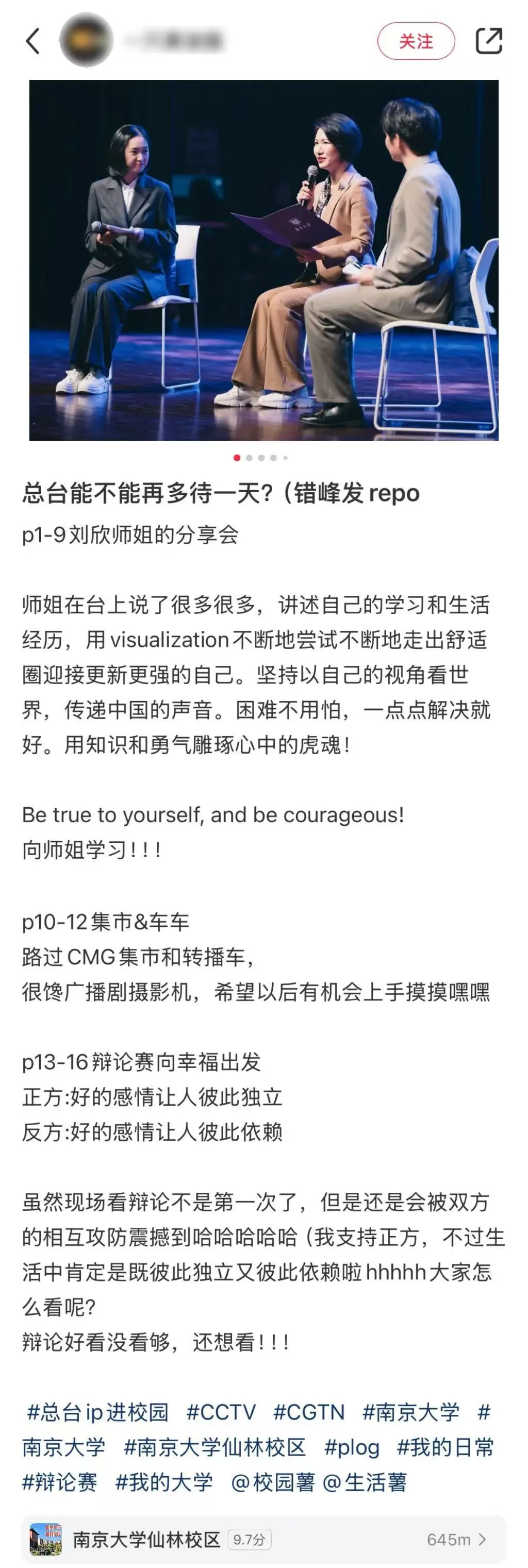 有仍在读研的航天博主感慨:“在校园见到总台对我而言是很新奇的体验,收获很大,也让我更坚定自己的航天梦想。”有学习艺术的同学分享:“听到名家对于流行音乐与越剧结合的想法,十分受用,希望在总台的传播下戏曲能得到更好的传承与发展。”