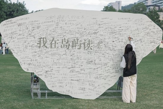 在节目的线下主题日,一块巨大的岛屿形状的展板上写着:“我在岛屿读《》。”书名号中间的内容留待读者填空。不到半日,整块展板上密密麻麻写满了书名:《活着》《第七天》《我与地坛》《生死疲劳》……