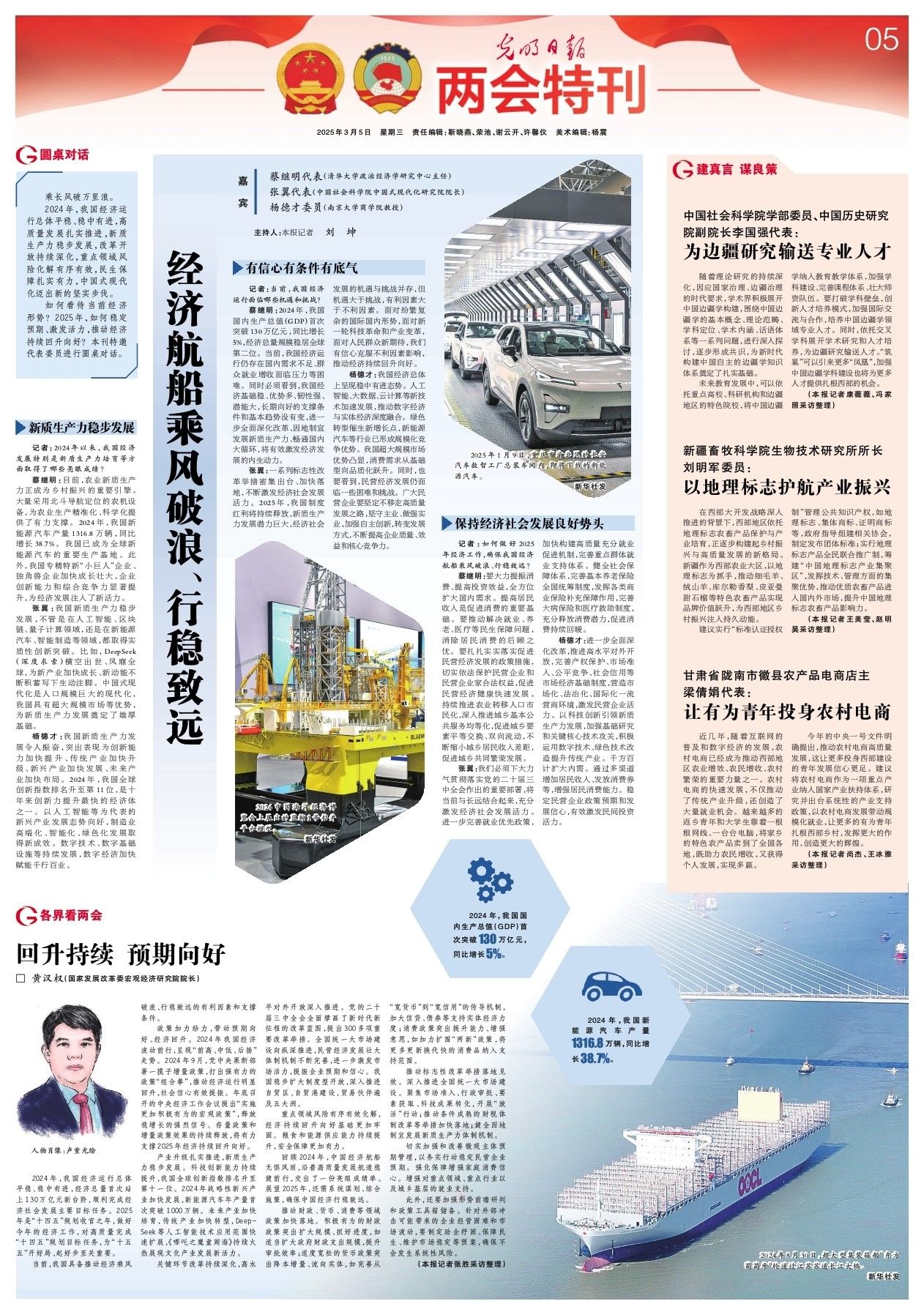 蔡继明:目前,农业新质生产力正成为乡村振兴的重要引擎。大量采用北斗导航定位的农机设备,为农业生产精准化、科学化提供了有力支撑。2024年,我国新能源汽车产量1316.8万辆,同比增长38.7%。我国已成为全球新能源汽车的重要生产基地。此外,我国专精特新“小巨人”企业、独角兽企业加快成长壮大,企业创新能力和综合竞争力显著提升,为经济发展注入了新活力。
