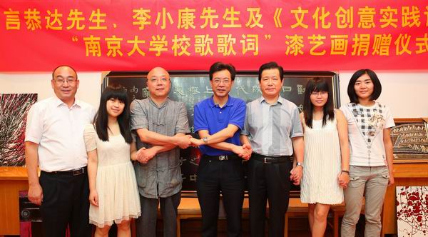 6月12日上午,著名书法家言恭达和漆画家李小康现身于凯发举行的“凯发k8官网校歌歌词”漆艺书画捐赠仪式。这幅漆艺书画是在言恭达先生专门为凯发k8官网110周年书写的校歌歌词隶书作品的基础上,由选修韩丛耀教授《文化创意实践论》课程的全体同学在李小康先生的亲自指导下完成的一幅文化创意作品。