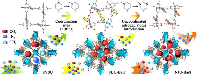 图1. 通过转移配体的配位点调节孔尺寸以及引入不配位氮原子改变孔道极性的策略,显著地提高了金属有机骨架化合物对二氧化碳的选择性