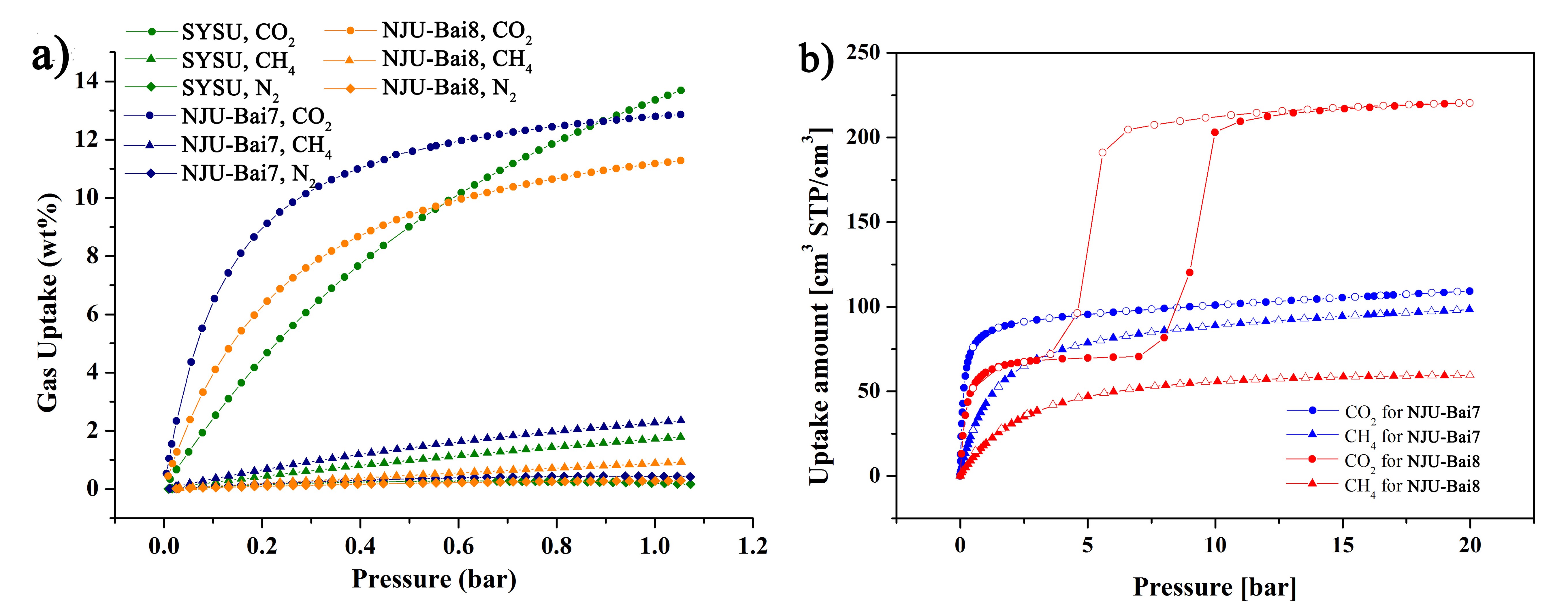 图2. 在298 K温度下,SYSU, NJU-Bai7和NJU-Bai8对二氧化碳,氮气和甲烷的吸附曲线。a)0-1 bar;b)0-20 bar。