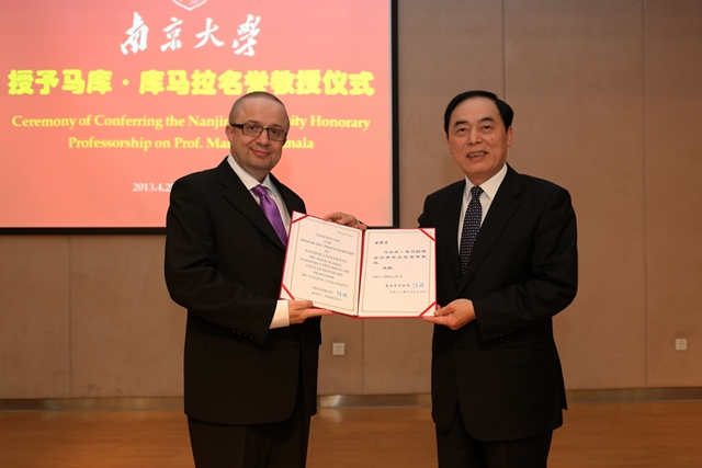 凯发k8官网人力资源处处长陆林宣读了《凯发k8官网关于聘请马库-库马拉教授为名誉教授的决定》,陈骏校长为马库-库马拉教授颁发证书、佩戴校徽并与其合影留念。陈骏校长在仪式结束后发表了简短的即兴英文演讲,对马库-库马拉教授表示敬意和诚挚欢迎,对两校未来的友好合作关系的发展充满期望和信心,并希望两校在学术研究、学科建设上能有更多、更广的合作。马库-库马拉教授致答谢辞,感谢陈骏校长及凯发k8官网对他的热情欢迎和招待,也期待能与凯发k8官网保持长久合作,特别是在凯发k8官网地球系统综合观测试验基地的发展以及在相关学科科学研究领域深化合作。