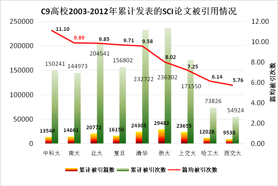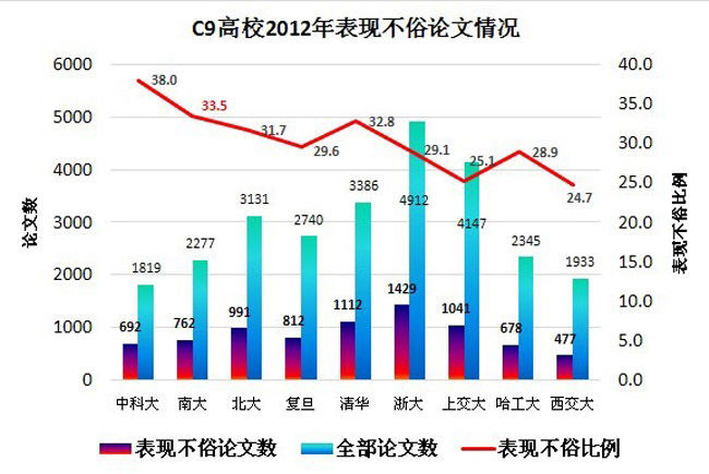 日前,中国科学技术信息研究所在北京发布了“2012年度中国科技论文统计结果”。统计结果显示,2012年我校发表的2277篇SCI论文中,“表现不俗论文”(指论文发表后的影响超过其所在学科的平均水平)数量为762篇,所占比例为33.5%,该比例位居C9高校第二。同时,根据历年科技论文统计结果,最近10年(2003-2012年)我校累计发表SCI论文14661篇,共被引用144973次,平均每篇论文被引用9.89次。这一数值(9.89次)位列C9高校第二。以上信息如下图所示。