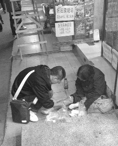 10月26日,夜幕下,在广州路路口,一个小伙子蹲在地上帮一位行乞的老太太包扎腿上的伤口。之后,这张充满正能量照片在网上热传。
