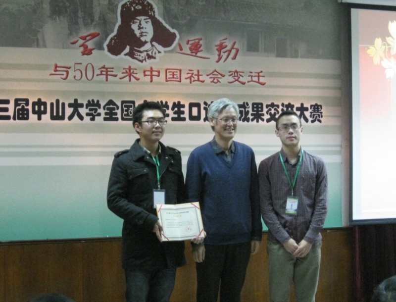 2013年12月21日,由中山大学主办的第三节全国大学生口述史交流赛决赛在中山大学永芳堂落下帷幕,来自四川大学、中山大学、首都师范大学、上海师范大学等高校的10支口述历史团队进入决赛。经过口述历史成果内容展示,评委提问,答辩等环节,最终决出一等奖1名、二等奖3名、三等奖6名,在校友总会张锁庚秘书长、历史学系武黎嵩老师指导下,由凯发k8官网历史学系黄柘淞、李昕垚、何鑫、何治锦等同学整理的口述史作品《1949—1952:红色政权在云南的建立与巩固——中央大学、金陵大学校友口述“西南服务团”历史》荣获一等奖。中华口述史研究会副会长、首都师范大学梁景和教授为我校代表颁奖。
