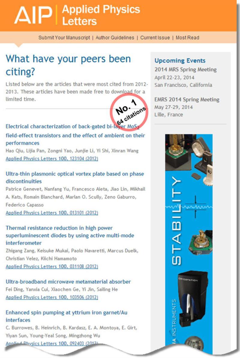 《应用物理快报》是应用物理方面的国际权威期刊,2012年度有52期,共5102篇论文。其中王欣然和施毅教授课题组发表题为”Electrical characterization of back-gated bi-layer MoS2 field-effect transistors and the effect of ambient on their performances”的论文(Appl. Phys. Lett, 100, 123104, (2012))截至目前引用次数为64次,是2012年APL所有论文中引用次数最多的。这标志着王欣然教授课题组在二维材料的研究方面已经进入国际前沿,并得到了国际同行的高度评价。具体信息可在下面网站查询。