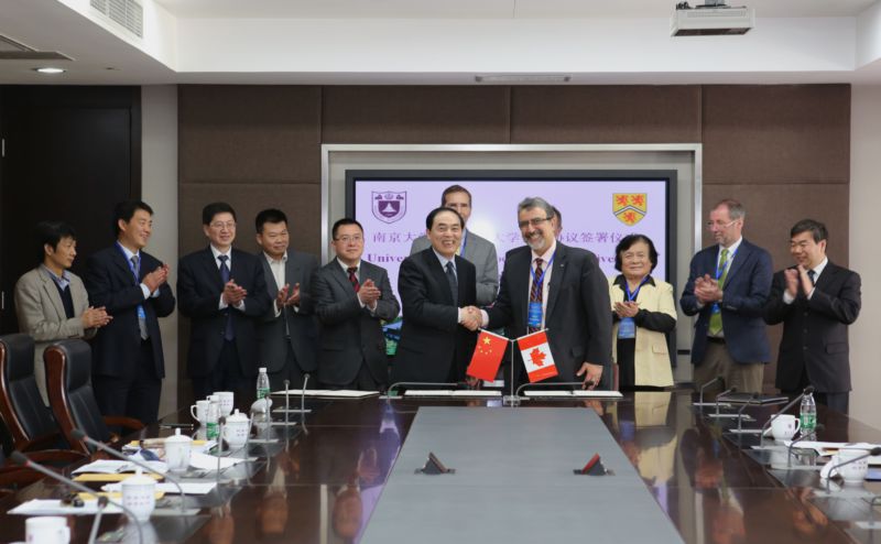 2014年4月23日,滑铁卢大学校长弗里登·汉杜拉普率团访问我校。滑铁卢大学是我校在加拿大的长期紧密合作伙伴,陈骏校长和洪银兴书记分别会见代表团,双方畅叙友情并共同展望未来合作。参加会面的还有王颖院士及来自我校海外教育学院、地理与海洋科学学院、物理学院、计算机科学与技术系、化学与化工学院、非洲研究所及国际合作与交流处代表。