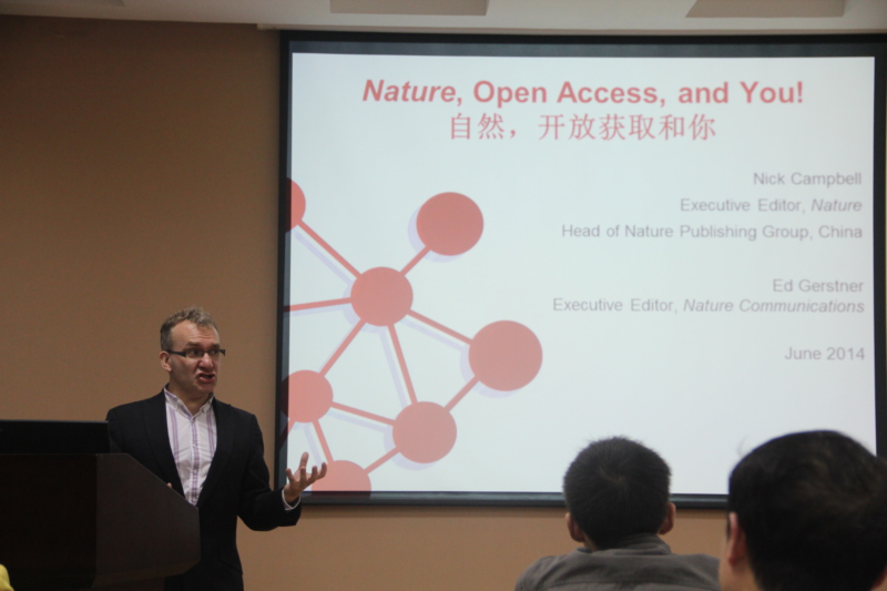 下午,Nick Campbell和Ed Gerstner在唐仲英楼会议室为我校师生做了题为“《自然》、开放获取与你”的专题报告。报告会由校长助理李成主持。两位执行主编向我校师生介绍了如何在《自然》及其他顶级期刊上发表论文、研究人员在选择发表论文的期刊时应考虑的因素以及自然出版集团开放获取出版物概览等。两位主编的报告吸引了我校来自物理、化学、生物、材料、医学等学科师生的关注,他们还与师生们积极讨论互动。李成在报告会结束时指出,希望我校今后能与自然出版集团加强联系,为我校师生提供更多与《自然》零距离接触的机会。(科学技术处 陈晓清 国际合作与交流处 陈楠)