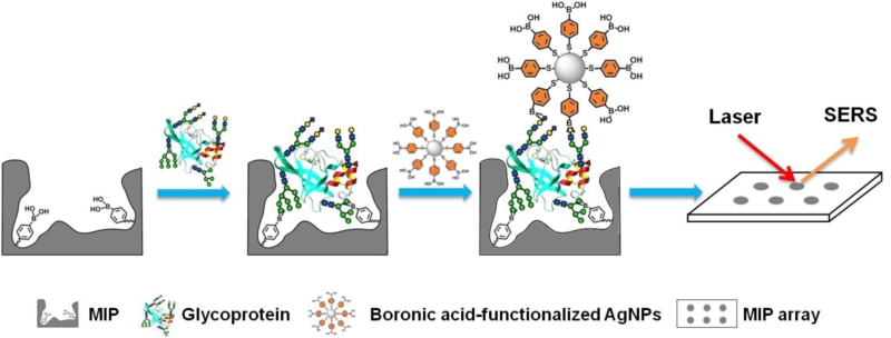 糖蛋白是最常见的蛋白质类型,在生物体中具有多种重要的作用和功能。此外,糖蛋白具有重要的临床诊断价值,目前用于疾病诊断的蛋白质疾病标志物大多为糖蛋白。由于具有重要生理意义或诊断价值的糖蛋白的表达丰度极低,对复杂样品体系中糖蛋白的专一识别和灵敏检测是重要的挑战性课题。免疫分析是临床诊断等许多领域中的重要研究工具,但存在着明显的缺点,如高专一性抗体不易获得、酶和抗体等生物试剂的稳定性差、化学标记试剂对健康有害和对样品环境敏感等。分子印迹(Molecular imprinting)是制备具有类似抗体专一识别性能的仿生识别材料的重要技术。我校化学化工学院刘震教授研究组近年在分子印迹领域连续取得进展,建立了普适高效的硼亲和分子印迹法,制备出性能先进的分子印迹聚合物,并将其替代免疫分析中的一抗,成功应用于疾病标志物糖蛋白的检测(Angew. Chem. Int. Ed. 2013, 52, 7451-7454; Chem. Sci. 2014, 5, 1135-1140; Anal. Chem. 2014, 86, 959-966)。该研究组近期进一步将分子印迹技术与表面增强拉曼散射(SERS)相结合,发展出免抗体、免酶的高专一性、高灵敏度糖蛋白检测方法—硼亲和夹心法。表面增强拉曼散射具有高灵敏度、无需有毒有害试剂和对样品环境不敏感等优点。该方法利用硼亲和分子印迹聚合物与硼亲和表面增强拉曼散射探针对目标糖蛋白进行双重识别以保证分析的专一性,同时利用表面增强拉曼散射提供高灵敏检测。该方法成功应用于人血清肝癌标志物甲胎蛋白的检测,克服了常规免疫分析的缺点,且具有成本低、稳定性和分析速度快等优点。该方法为普适性方法,可适用于各种糖蛋白。此外,若与手持式或便携式拉曼光谱仪联用,可应用于床旁检测和现场检测。该方法在临床诊断、兴奋剂检测和质量控制等领域具有重要应用前景。该工作于7月28日在线发表于《德国应用化学》(Angew. Chem. Int. Ed. 2014, DOI: 10.1002/anie.201405525)上,论文第一作者为硕士生叶金。该工作得到国家自然科学基金面上项目和国家重大科学研究计划等基金的经费支持。(化学化工学院、科学技术处)