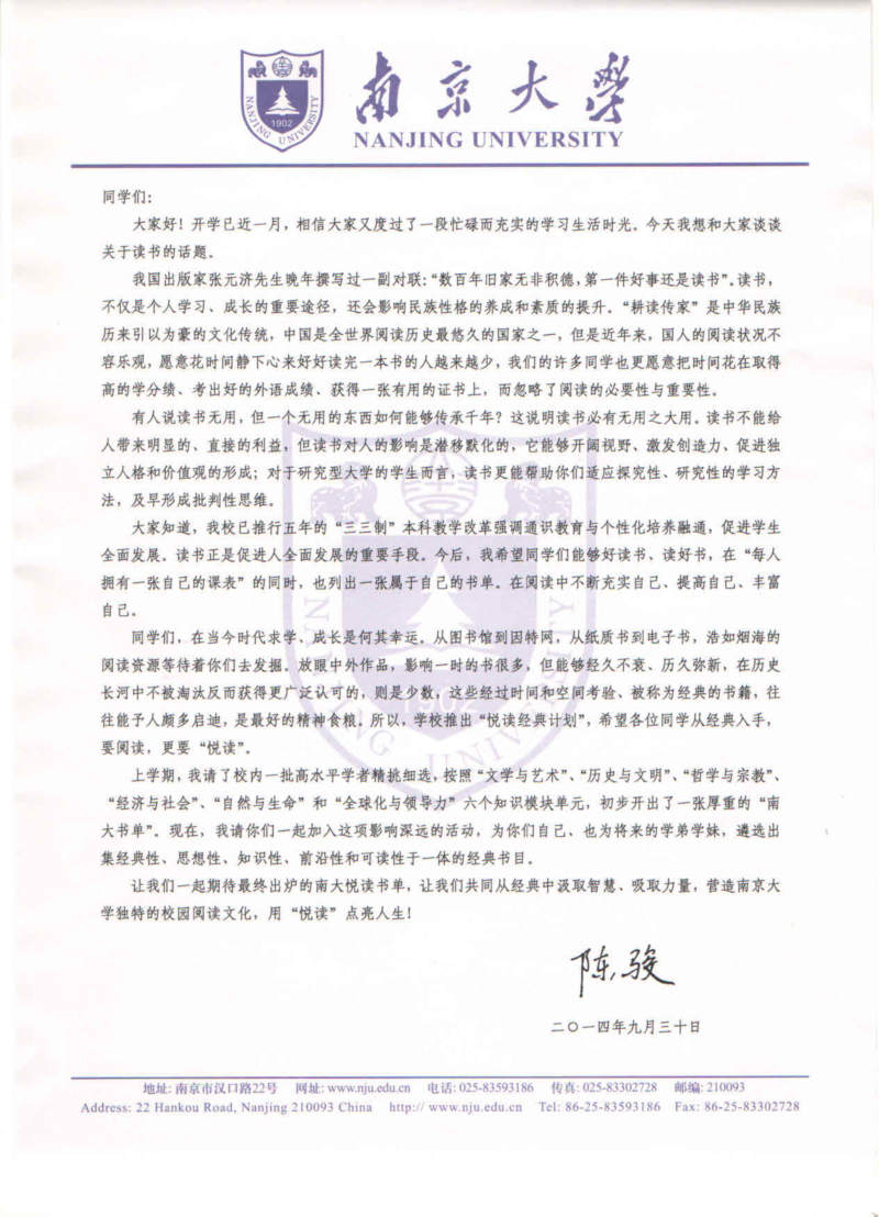 “悦读计划”的实施得到了学校党政领导的持续关注和支持。陈骏校长还专门致信全体学生,希望他们在人生中最宝贵的大学时光里,养成“好读书、读好书”的良好阅读习惯,并建议学生“从经典入手,要阅读,更要‘悦读’”。