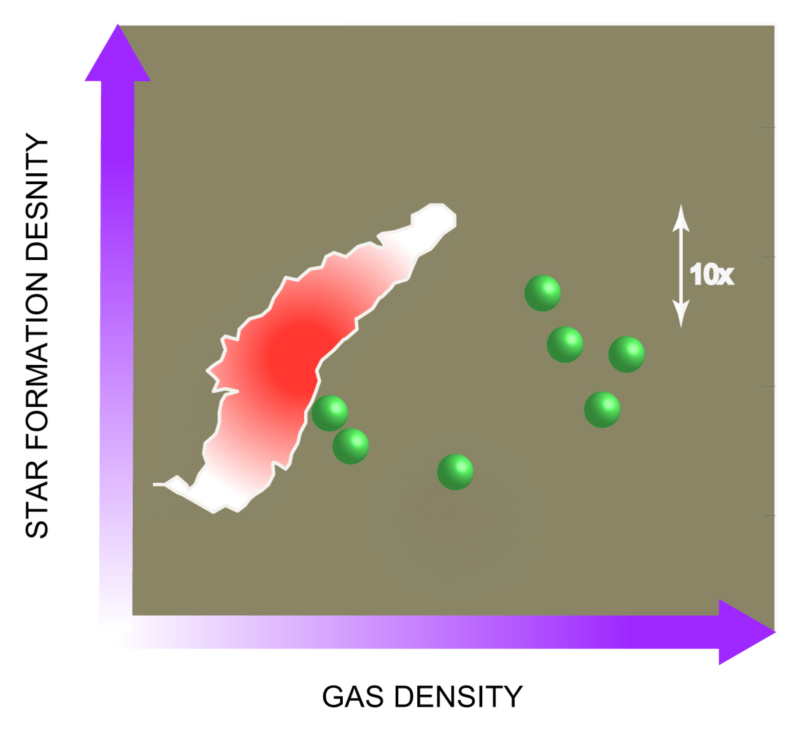 图2:恒星形成率(单位时间内形成的恒星质量)对气体质量的二维图。橘黄色-白色区域是类银河系在图上的分布,七个绿色的球代表论文中两个星系七个恒星形成区在该图的分布。最右边的双向箭头长度代表了恒星形成率10倍的变化(图由施勇制作和提供)。