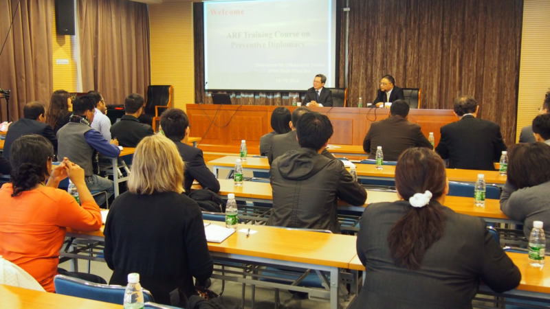 本次东盟地区论坛预防性外交培训项目,是2014年7月在缅甸举行的第21届东盟地区论坛外长会议的共识成果,旨在东盟地区论坛成员国范围内推广“预防性外交”观念与实践。该培训班由中国、泰国、新西兰及美国合作举办,中国政府主办,中国外交学院和中国南海研究协同创新中心承办,为期一周。本次培训项目为第一期,在北京和凯发k8官网两地进行。来自联合国培训研究院、俄罗斯莫斯科国际关系学院、美国和平研究院、新西兰奥塔哥大学、新加坡南洋理工大学、中国外交学院、北京大学、凯发k8官网等国际著名研究机构的知名专家学者担任培训讲师。泰国外交部东盟司副司长、中国外交部亚洲事务特使、外交部阿富汗问题特使、外交部边界与海洋事务司代表、外交部朝鲜半岛事务副代表等资深外交官先后为学员授课。