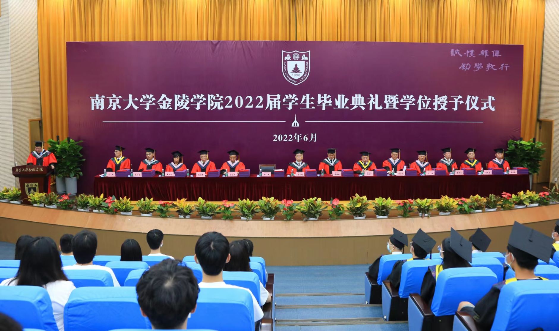 毕业典礼上,学院副院长张亚权宣读《凯发k8官网金陵学院关于表彰2022届优秀毕业生的决定》《凯发k8官网金陵学院关于授予学士学位的决定》,副院长、副书记秦志祥宣读《凯发k8官网金陵学院关于聘任2022届校友联络员的决定》。主席台就座领导分别为优秀毕业生代表、校友联络员代表颁发荣誉证书和聘书,为全体获得学士学位的毕业生颁发了学位证书。