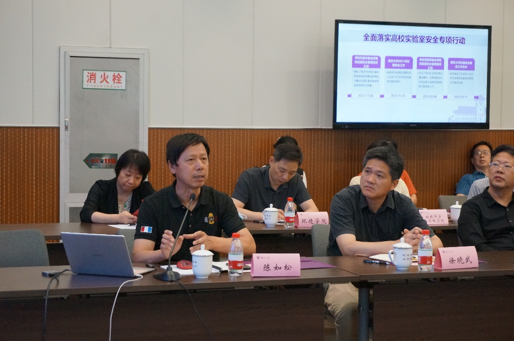 实验室与设备管理处副处长陈如松从实验室安全责任体系、安全培训教育、应急管理、实验室安全分级管理、安全检查与隐患整改、危险化学品及生物安全管理、其他专项管理及上一轮检查整改情况等方面汇报了学校实验室安全工作开展情况。