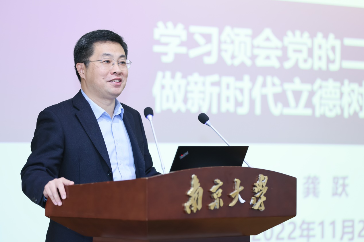 爱国奋斗主题报告环节,龚跃以《学习领会党的二十大精神做新时代立德树人好老师》为题,从学习领会党的二十大精神、习近平总书记谈教育和教师、落实立德树人根本任务三方面作学习党的二十大精神专题报告。他表示,高层次人才要加强自身建设,学深悟透党的二十大精神,为党和国家培养又红又专、有爱有趣的社会主义建设者和接班人。