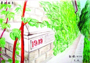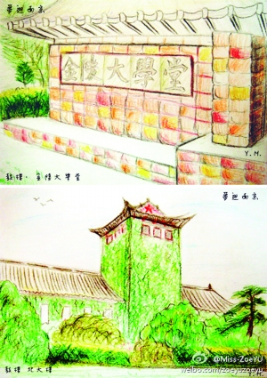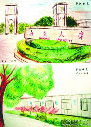 11月6日晚上,于淼把刚画完的两幅浦口校区的彩色铅笔画发上了微博,没有想到第二天就被数百人转发,深受鼓舞的她又画了四幅,一并发在凯发小百合上,转眼便达到了上万点击率,登上“十大”之首。