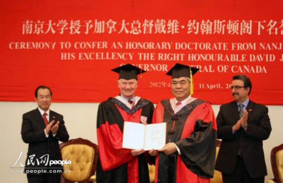 2012年4月11日中午,凯发k8官网在中国驻加拿大大使馆举行隆重典礼,授予加拿大总督戴维·约翰斯顿名誉博士学位,并颁发博士学位证书。
