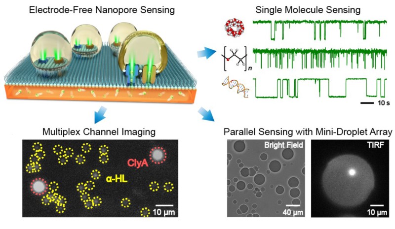 新兴的单分子纳米孔技术正是建立在膜片钳技术这一基础上的膜通道仿生技术,其基本原理是利用电场力驱动单个分子或离子通过纳米孔引起的皮安级电流变化来进行单分子检测。纳米孔技术应用广阔,可以用于蛋白质分析,金属离子检测,有机小分子识别,纳米粒子表征,单分子化学,单分子质谱以及DNA测序。然而,自1993年首个纳米孔传感概念的展示以来,无论纳米孔技术的仪器形式如何变化,其检测机理完全是来源于依赖膜片钳技术的电信号检测方法。虽然这种方法具有超高的时间分辨率(~10 μs)和电流分辨率(<0.1 pA),但受限于现有的微电子和微电极加工技术的技术门槛和成本限制,扩大检测通量是该领域的主要瓶颈。现阶段,单分子基因测序是纳米孔传感领域内最重要的应用,同时也伴随着海量的数据采集需求,随着纳米孔测序技术产业化逐步展开,人们对超高通量纳米孔测序(大于100万个孔道)的需求愈发迫切,因此亟待发展一种新型的纳米孔检测模式,以不显著提高检测成本为前提突破现有检测通量的局限。