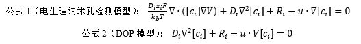 受此启发,我校化学化工学院生命分析化学国家重点实验室陈洪渊、黄硕团队开发了一种新型的纳米孔检测方法,并将其命名为无电极纳米孔技术(DOP,DiffusiOptoPhysiology),也是世界首个无需电极的单分子纳米孔检测方法。该团队在纳米孔的两侧分别加入钙离子与钙离子荧光染料,在浓度梯度驱动下,钙离子自由扩散穿过纳米孔与荧光染料结合释放荧光信号,从而间接实现?纳米孔在液滴-凝胶界面双分子层上实时成像,并成功展示了其对小分子、高分子与生物大分子的单分子传感。这项技术充分简化了传统的纳米孔检测模型(能斯特-普朗克方程,公式1),去掉了电迁移项在物质传递中的贡献,仅由扩散、化学反应和流体三项来描述物质的传递(公式2):