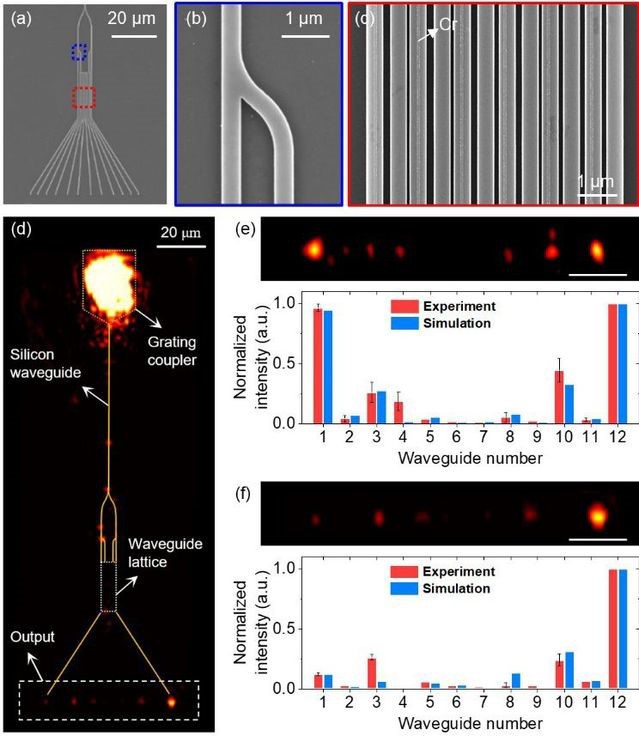 (a-c)样品的SEM图;(d)近红外相机拍下的整个结构的光场演化;实验中得到的准零模(e)和严格零模(f)的样品输出端强度分布图。