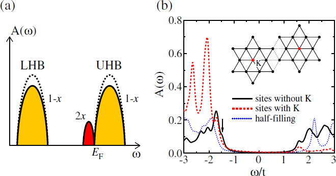 图 3: (a) 常规的电子掺杂Mott绝缘体的Hubbard模型;(b) 集团微扰理论计算的局域态密度,蓝色虚线表示半填充未掺杂的系统,掺杂以后覆盖K+离子和未覆盖K+离子的谱线分别用红色虚线和黑色实线表示,箭头标注了附加激发态的位置