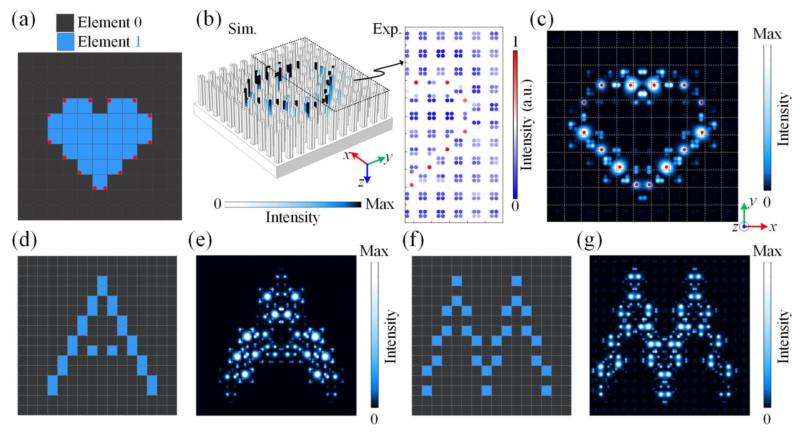 图4:(a) 心形声学成像器件的结构排布。(b) 仿真和实验结果。(c) 结构表面上方0.1 mm处声强分布。(d)-(g) 字母“A”形和“M”形成像器件的结构排布和声强分布。