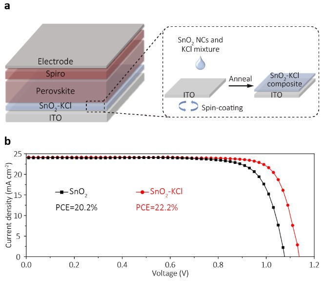 针对这一问题,谭海仁课题组借鉴了前期相关工作基础(DOI: 10.1126/science.aai9081),将稳定的无机物氯化钾加入到电子传输层二氧化锡纳米晶中。留于电子传输层表面的钾离子和氯离子可以钝化该界面,减小缺陷态导致的非辐射复合,提高载流子的抽取能力。同时,存于电子传输层表面的钾离子在上层钙钛矿薄膜的旋涂与退火的过程中,能够部分地扩散至钙钛矿膜层中,并聚集于钙钛矿晶界处。此处的钾离子可以显著降低缺陷密度,提升辐射复合的比例。由于非辐射复合的抑制以及更高效的载流子抽取能力,该策略将电池的开路电压由最初的1.077V 提升到1.137V,电池效率从20.2% 提升到22.2% (如图一所示)。
