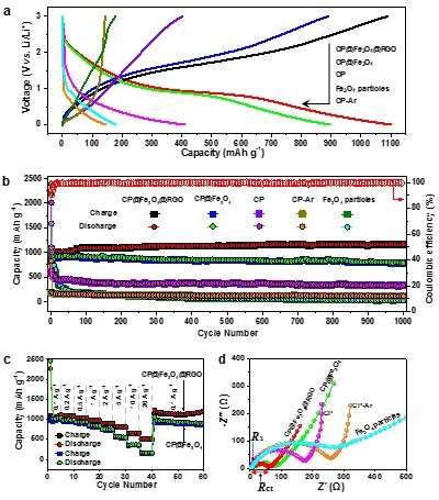图3. CP@Fe3O4@RGO电极及对比样的储锂性能。(a) CP@Fe3O4@RGO电极及对比样在第100圈的充放电曲线(0.5 A/g);(b) CP@Fe3O4@RGO电极及对比样的长期循环曲线(0.5 A/g);(c, d) 倍率测试图、EIS谱图。