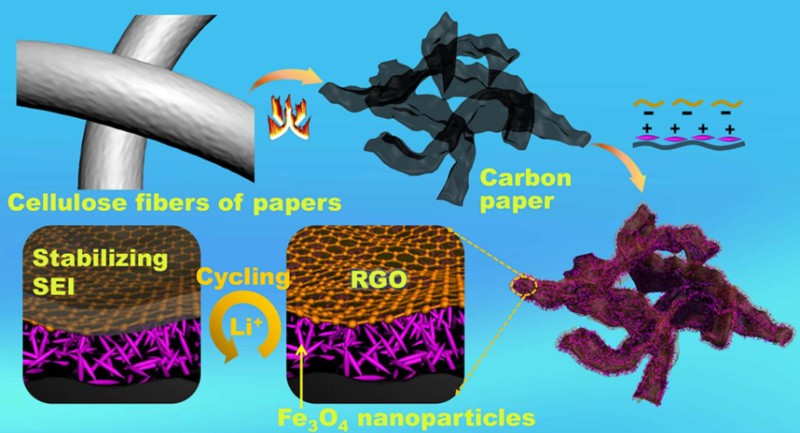 近日,现代工学院王学斌教授团队系统研究了纤维素的氧-氨联合热解反应过程,提出了一种制备三维石墨烯状碳纸(CP)的新方法,即酰胺化诱导的纤维素空间分离焦化法。该工作进一步以CP为载体,通过自组装的方法制备了三明治结构的自支撑电极(CP@Fe3O4@RGO),将此电极用作锂离子电池负极,可以缓解充放电体积效应,展示了极好的循环稳定性及倍率性能。CP材料具有高比表面积、高电导率、柔韧性等特点,可被视为一种通用的碳基三维导电网络块体材料,有望广泛应用于电化学电极等领域。该成果近日以“Biomass-Derived Carbon Paper to Sandwich Magnetite Anode for Long-Life Li-Ion Battery”为题发表在纳米材料领域国际权威期刊ACS Nano上(ACS Nano, 2019, 13, 11901-11911)。
