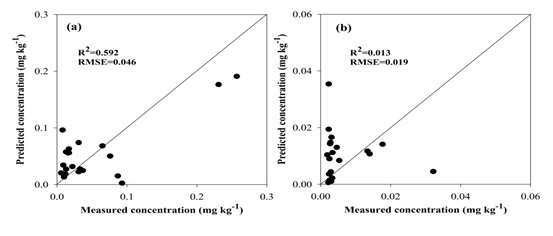 图2.重金属镉CaCl2提取态(a)和铅CaCl2提取态(b)含量测定值与预测值的相关关系。