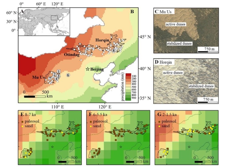 图2 沙丘双稳态以及我国北方沙地过去一万两千年以来的风沙环境变化(详细说明请见原文)