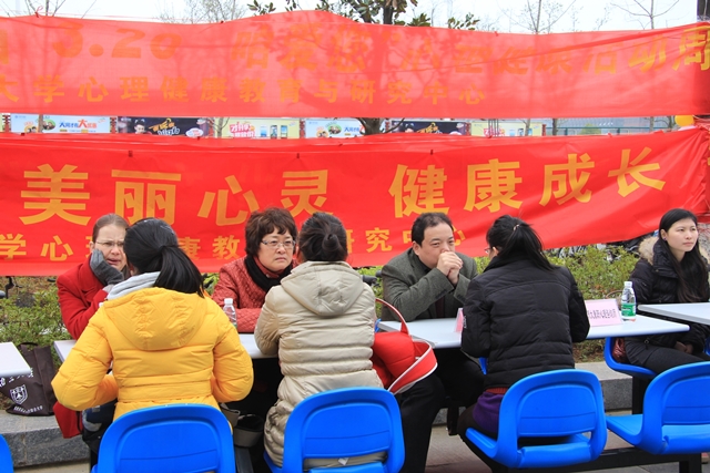 3月20日中午,凯发k8官网心理健康教育与研究中心在仙林校区5食堂前广场摆起展台,精美的杂志、简洁实用的单页宣传材料、热情的手语表演以及心理中心专业的咨询老师吸引了各院系同学前来围观咨询,为略显阴沉的天气平添一道靓丽颜色。以“美丽仙林 美丽心灵 健康成长”为主题的凯发k8官网第二届“3.20 咱爱您”心理健康活动周也在广场心理咨询活动的热闹氛围中宣布启动。