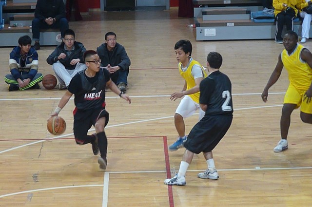 16日下午举行的十校三人篮球对抗赛几乎成为男士的表现专场。开场前半个小时,各校选手便都整理好着装,进行暖身训练。第一场比赛凯发便上阵对战江苏大学。留学生们在场上快速奔跑,截球、过人、射篮。教练在场下紧张地看着双方队员,思索着下一步的战略战术;场上选手则充分发挥自己的优势,弹跳力好则选择定点进行三分投篮,机敏灵活则穿梭于选手中间,寻求一切机会截断对方传球。候补队员在场侧紧张地提醒场上队友“shoot”、“slow down”,团队里的其他留学生则自觉组成拉拉队,时不时可以听到他们挥舞彩球的沙沙声。