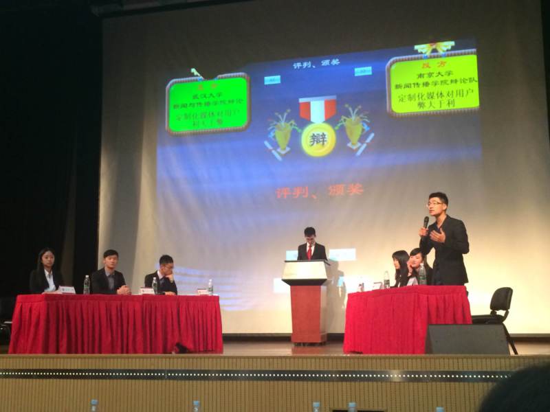 在决赛中,我校新闻传播学院辩论队与传统强队——武汉大学新闻与传播学院辩论队就“定制化媒体对用户利大于弊/弊大于利”开展激烈辩论,我校辩论队持反方立场,从定制化媒体泄露隐私、不利于用户全面发展、撕裂社会共同体等方面立论,以深厚的学术涵养和严密的逻辑论证击败对手,以比分24:3的绝对优势获得最后的胜利。(新闻传播学院)