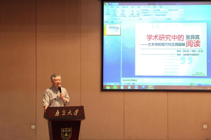 微微的小雨不减大家的热情,同学们早早到来,最终报告厅座无虚席,甚至有不少同学全程站立,认真聆听讲座。在同学们的期待和掌声中,被同学们称为“男神”的张异宾教授走上讲台,缓缓开启了他对于现代性文本学的解读。