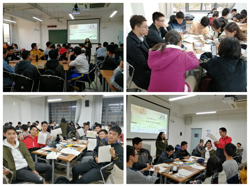 芮富宏老师带领同学们开启了自我探索之旅。芮老师首先请每位同学挑选了一张卡牌,并将同学们随机分为7组,每组8位同学。随后,芮老师循循善诱,层层深入,带领各组同学选择一种动植物绘制自我“名片”、闭上眼睛想象并画出想到的一颗树、回忆并写下感到最成功或最高兴的事、利用组内所有卡牌讲述一个以“梦想”为主题的故事。通过四个有趣的活动,借助生动的形象或故事,芮老师引导同学们对自我性格、成长经历、成功体验、价值观与梦想进行了深入探索。在每个活动环节过程中,小组内同学都进行了热烈讨论与分享,并由各小组依次向所有同学进行了分享展示。