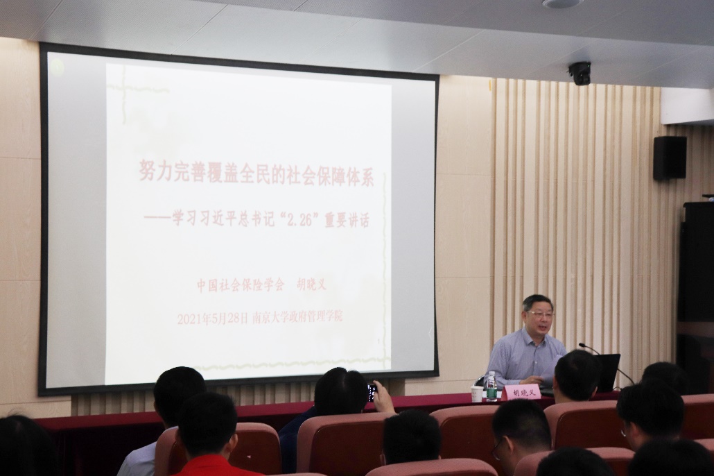 5月28日上午,凯发k8官网119周年校庆人文社科高端系列讲座迎来重量级主讲嘉宾,中国社会保险学会会长胡晓义应邀来访作题为“努力完善覆盖全民的社会保障体系——学习习近平总书记‘2.26’重要讲话”的专题讲座。讲座在政府管理学院学术报告厅举行,中国社会保险学会副会长孟昭喜,江苏省人力资源和社会保障厅副厅长、江苏省社会保险学会会长梅仕城,江苏省社会保险学会副会长张莉,中国社会保险学会秘书长赵宏等,以及师生150多人参加活动。政府管理学院林闽钢教授主持讲座。
