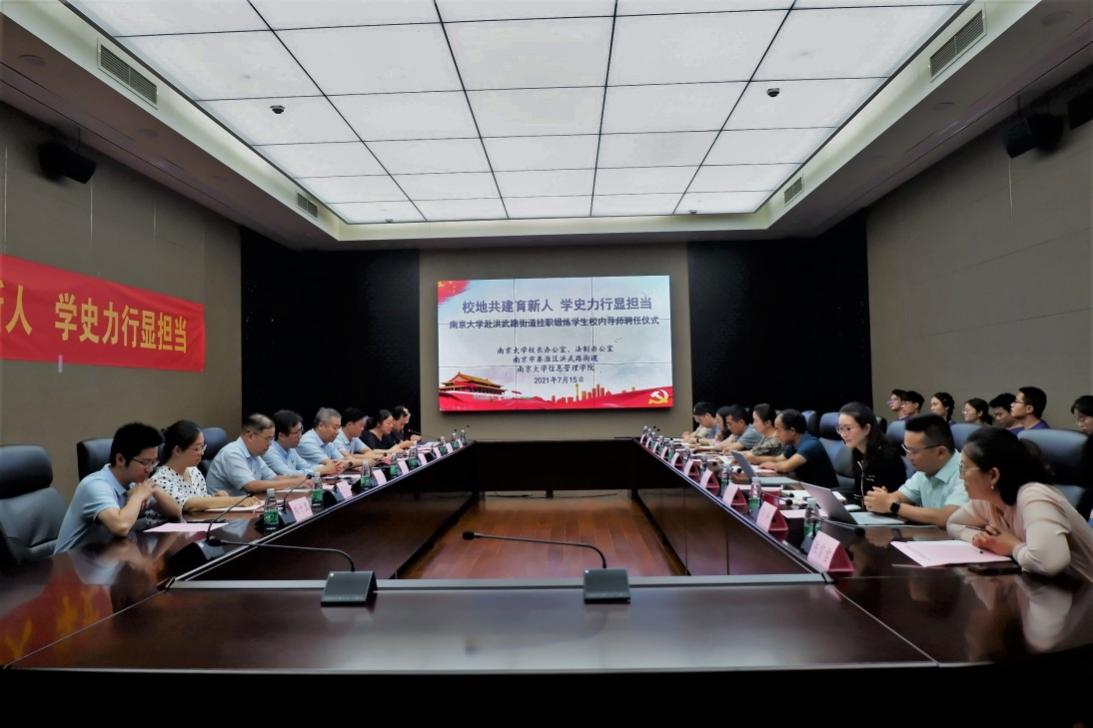 7月15日下午,"校地共建育新人学史力行显担当"主题党日活动暨凯发k8官网赴洪武路街道挂职锻炼学生校内导师聘任仪式在仙林校区行政南楼举行。活动由校机关党委校办法制办党支部、凯发k8官网市秦淮区洪武路街道党工委及信息管理学院党委联合举办。活动特邀洪武路街道政协工委主任、秦淮区委党史学习教育第一巡回指导组组长郁险峰,洪武路街道马府街社区原党委书记、现四级调研员米晅与会;校长办公室、法制办公室主任、校办法制办党支部书记杭祝洪,信息管理学院党委书记姜迎春,机关党委副书记范赟及校办法制办青年管理骨干、信管学院师生代表等参加活动。活动由信管学院党委副书记罗萍主持。