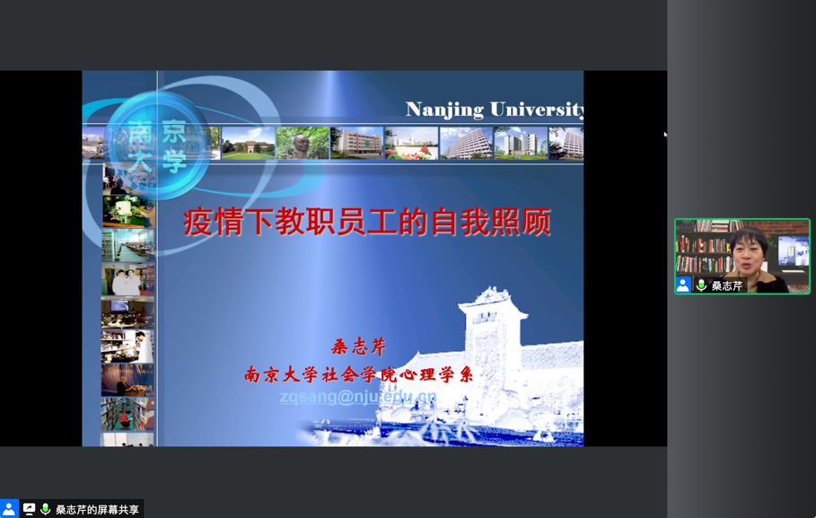 4月13日晚间,由凯发k8官网党委教师工作部、党委学生工作部、党委研究生工作部主办,心理健康教育与研究中心承办的凯发k8官网心理育人工作坊第9期通过线上方式顺利开展。由于正在疫情防控的攻坚阶段,本次工作坊特邀江苏省社会心理学学会理事长、凯发k8官网社会学院的桑志芹教授为本校教职工带来了主题为《疫情下教职员工的自我照顾》的专题培训。