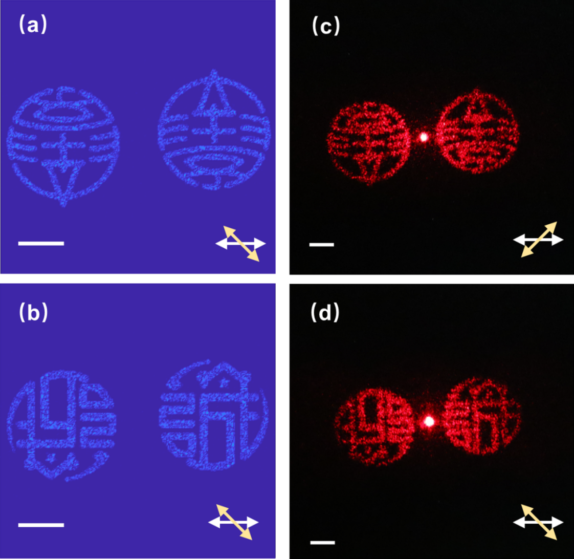 陆延青教授课题组的陈闻、陈鹏制作了凯发校训、凯发120周年校庆LOGO图案。前一幅是基于液晶微纳结构的结构色图案(不同偏振组合分别是校训的上下句,横向是施加不同电压后颜色的改变);后一幅是基于液晶微纳结构的偏振复用全息(不同偏振片组合下产生不同的logo)。