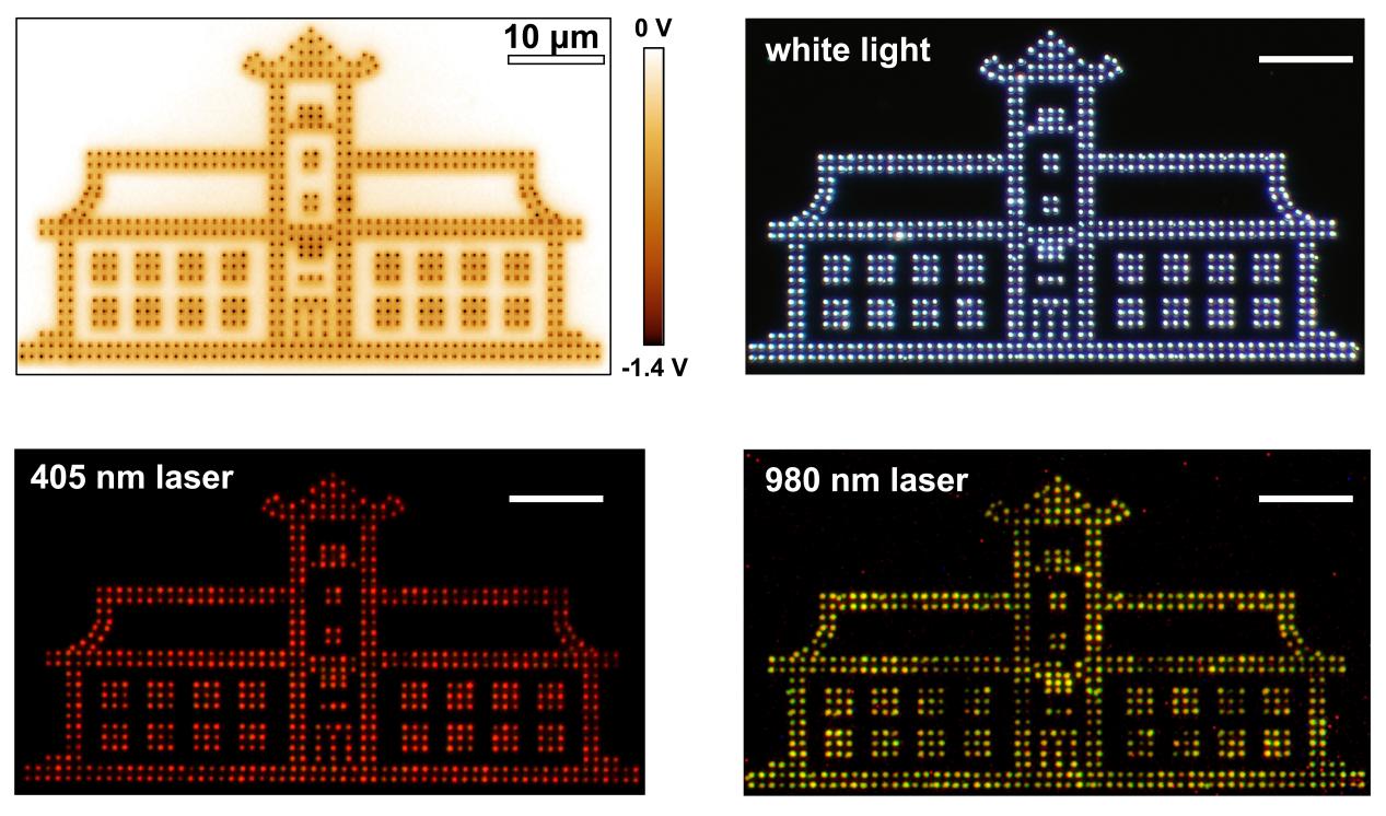 鲁振达教授课题组通过两种量子点组装制作了四张闪亮的北大楼图案。
