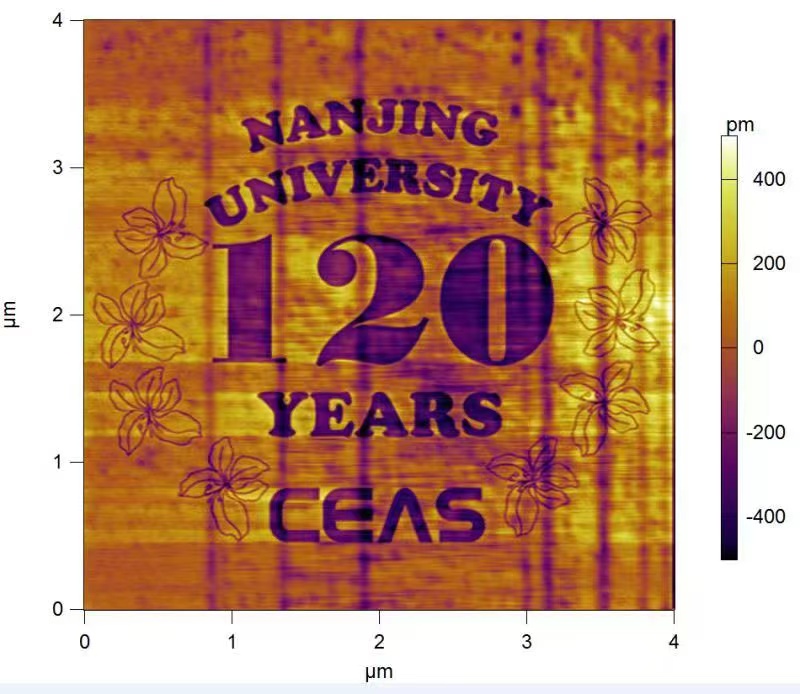 吴迪教授课题组以原子力显微镜表征图案献礼凯发120周年校庆。陈洪英通过制备钛酸铅铁电薄膜,自定义设计图案,利用明暗衬度定义不同电压,用原子力显微镜进行写入,根据铁电薄膜在不同电压下产生的极化响应创作了这幅图像。