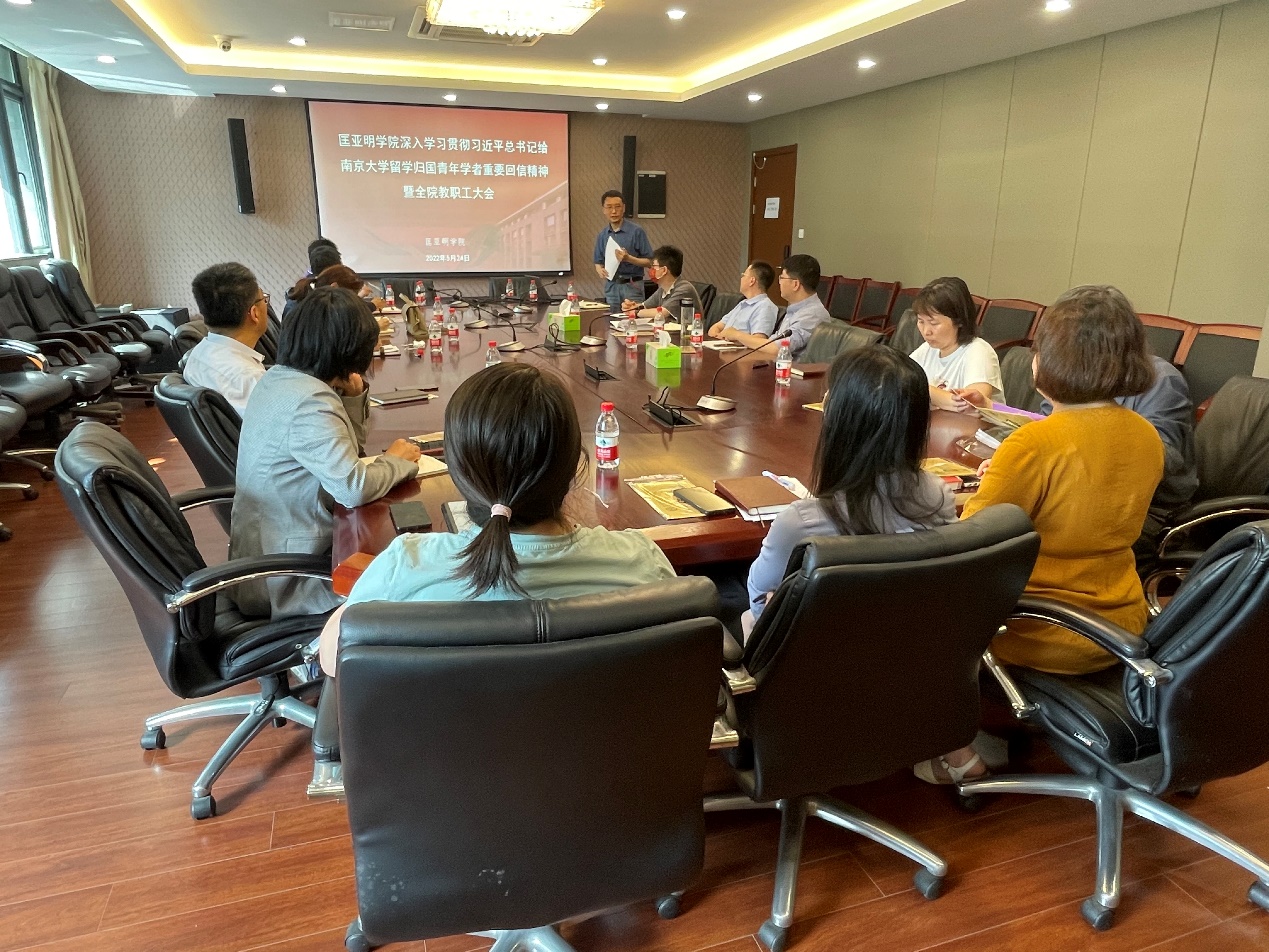 5月24日下午,匡亚明学院召开全体教职工大会,认真学习贯彻习近平总书记给我校留学归国青年学者重要回信精神。学院党委书记、院长王骏、党委副书记周安及全体教职工参会,会议由王骏主持。