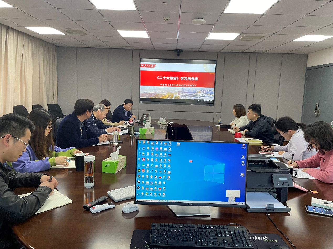 李海超老师以二十大报告的主题为切入点,从"《二十大报告》内容纲要"、"《二十大报告》重点内容"、"《二十大报告》思维特征"三个方面带领与会人员对二十大报告进行了深入学习,对报告中科教兴国战略、全过程人民民主、推进法治中国建设等部分的重要意义进行了阐述,对报告中的马克思主义中国化时代化新境界以及构建中国话语和中国叙事体系做了细致解读。